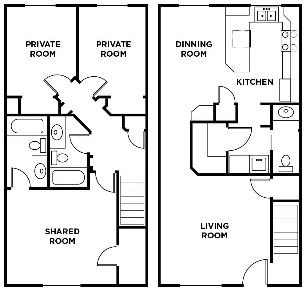 2 Private Bedrooms and 1 Shared Bedroom in each unit